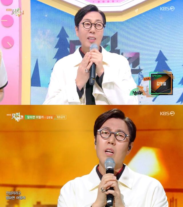 김영철은 14일 오후 방송된 KBS 2TV '뮤직뱅크'에 출연해 새 디지털 싱글 '말하면 어떨까' 첫 컴백 무대를 선보였다.