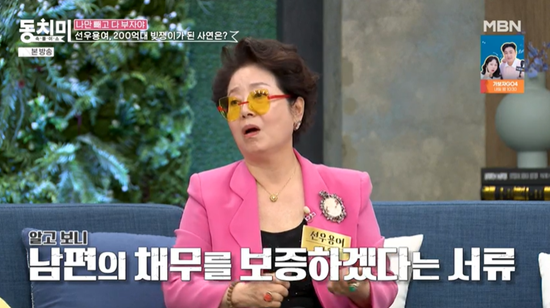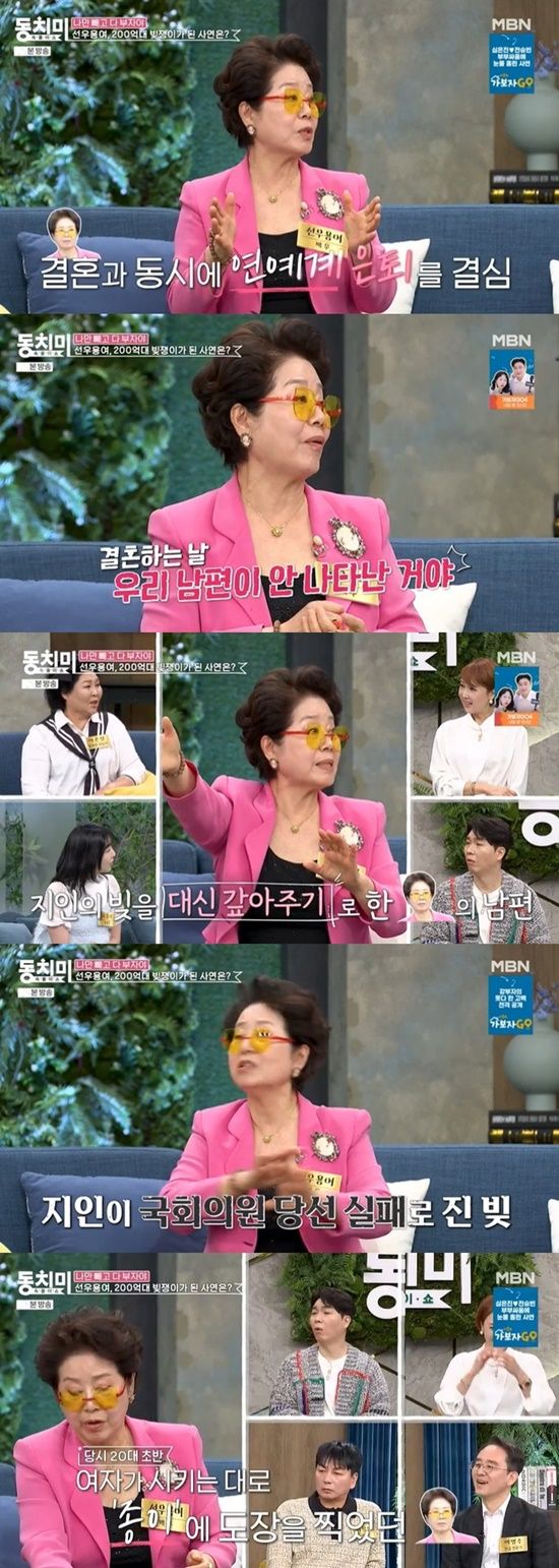 선우용여는 "알고 보니 남편의 지인이 국회의원 당선 실패로 진 빚 1750만 원을 우리 남편이 갚아야 한다는 종이였다. 채무를 보증하겠다는 서류였던 것이다"라고 얘기했다.