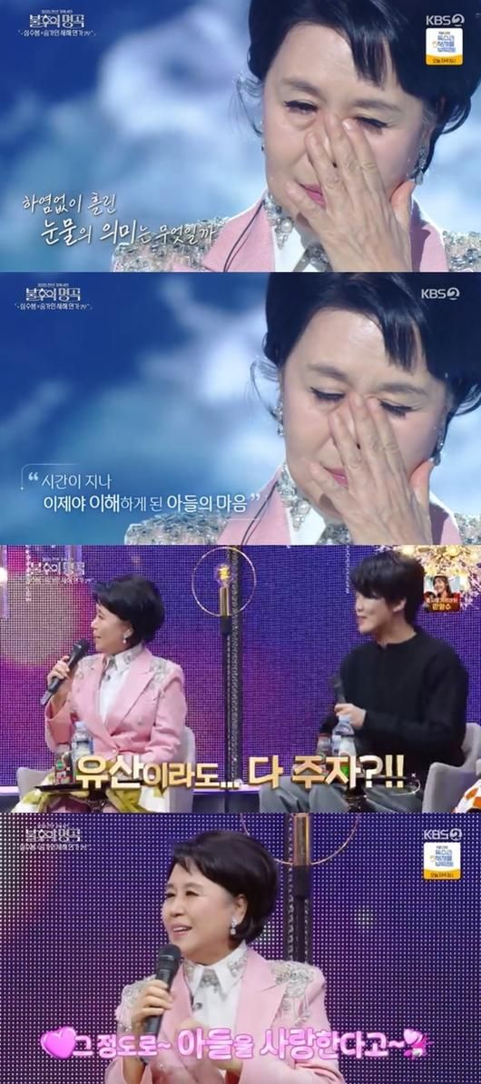 15일 방송된 KBS 2TV '불후의 명곡'은 '신년 기획 4탄: 심수봉, 송가인의 새해 연가' 2부로 꾸며졌다. 이날 심수봉은 아들 한승현 씨가 작사, 작곡한 곡 '심연 그 밖으로'를 열창하던 중 눈물을 흘렸다.