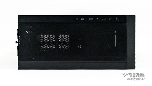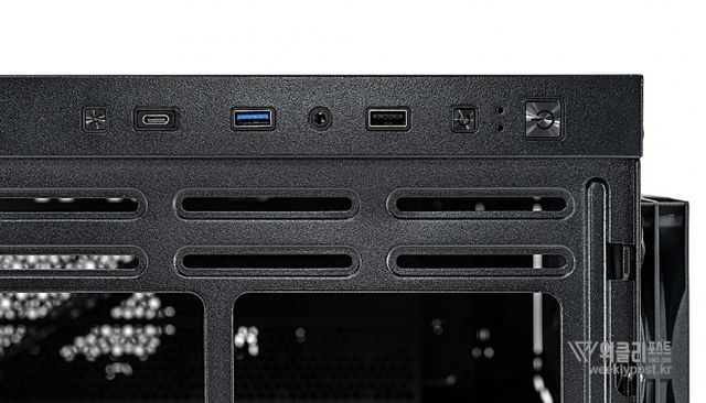 케이스 상단 우측에 위치한 입출력 패널은 편리한 사용성과 디자인을 모두 고려한 배치가 돋보인다. aRGB 작동 여부를 표시하는 LED, USB 3.2 Gen2 Type-C, USB 3.2 Gen1, HD 오디오, USB 2.0, 리셋 버튼, 파워 버튼이 세로로 정리돼 깔끔한 인상을 주며, 특히 USB 3.2 Gen2 Type-C 포트는 최대 10Gbps의 빠른 전송 속도를 지원해 고용량 데이터를 빠르게 전송해야 할 때 외장 드라이브 연결 용도로 활용하기에 적합하다.