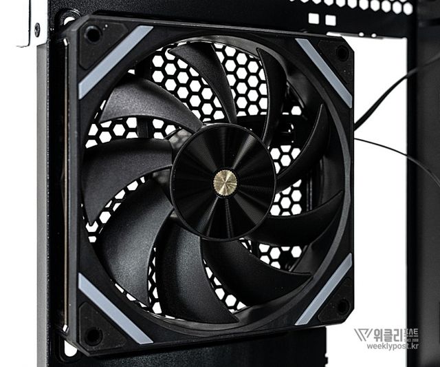 공랭식 케이스에서 핵심 역할을 하는 쿨링 시스템은 기본 제공되는 프리미엄 HDB 엣지팬을 중심으로 구성된다. 유체식 동적 베어링을 적용한 120mm 팬은 일반 팬보다 높은 풍량과 풍압을 제공해 내부 온도를 안정적으로 유지하며, 5만 시간의 긴 수명을 갖춰 내구성이 뛰어나다.