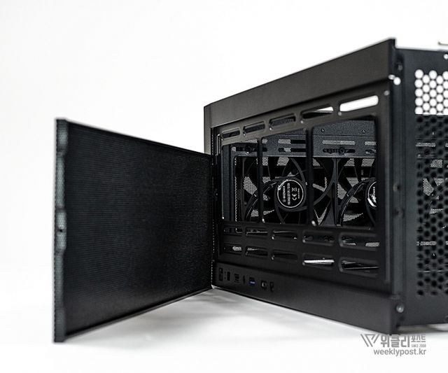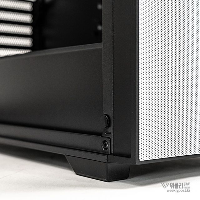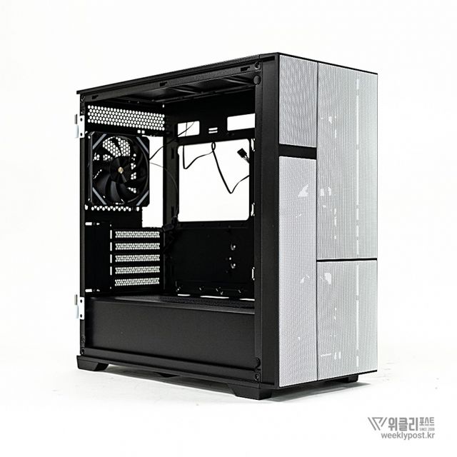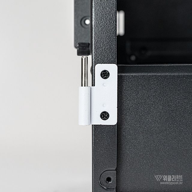 측면 패널에는 마그네틱 스윙 도어 디자인이 적용됐다. 힌지 방식의 강화유리는 문처럼 여닫을 수 있어 PC 내부 접근이 쉽고 빠르며, 일체형 손잡이 설계와 자석(마그네틱) 방식으로 번거로움을 줄였다. 또한, 케이스 4면 모두 도구 없이 손만으로 탈부착 가능하도록 설계되어 조립이나 부품 교체 시 편의성이 뛰어나다. 힌지, 핸드나사, 스냅 버튼 방식의 분리형 패널이 적용되어 유지보수 과정도 간편하다.