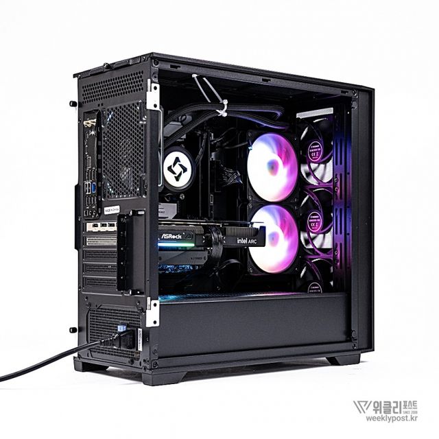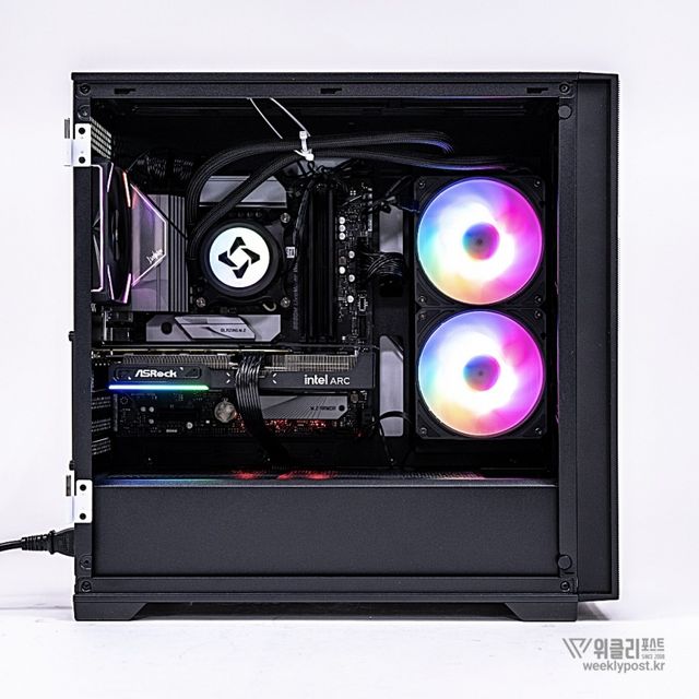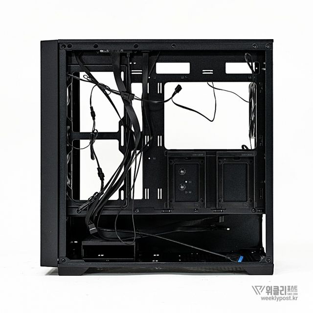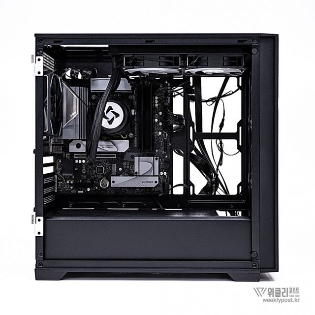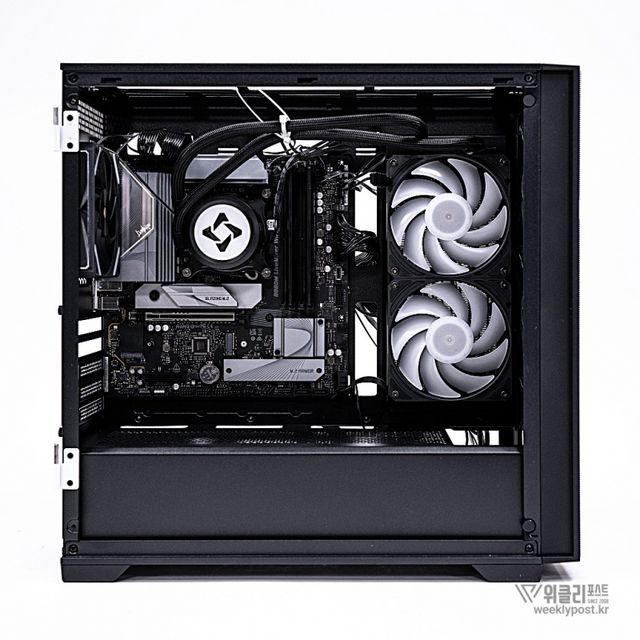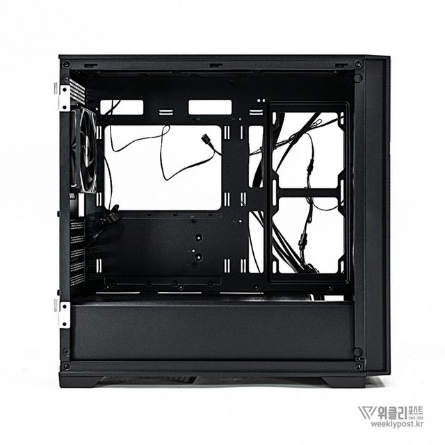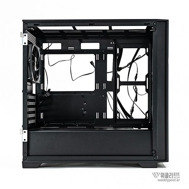 일반 케이스가 전면, 상단, 후면 쿨링팬만 제공하는 것과 달리, ML-360은 측면에도 쿨링팬 장착을 위한 가이드와 에어홀 패널을 기본 제공해 쿨링 성능을 한층 강화했다. 기본으로 장착된 aRGB 팬은 전면 120mm 3개, 후면 120mm 1개로 총 4개가 제공되며, 개별 구매 시 소요될 비용을 고려하면 6만 원 중반대 가격 대비 높은 가성비를 갖춘다.