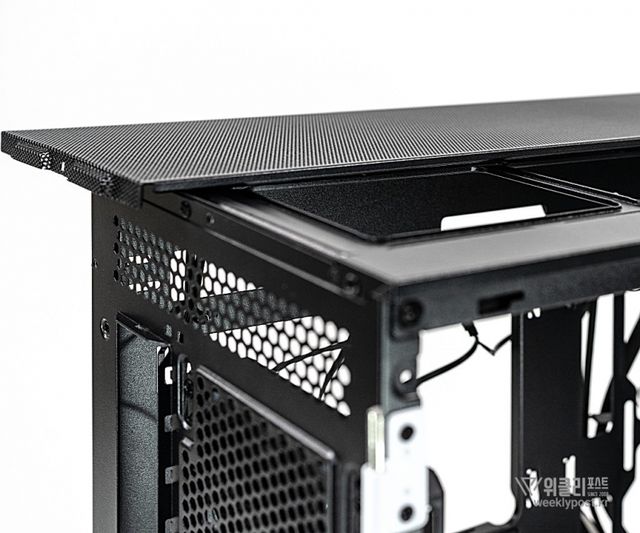 마이크로닉스가 자체 설계한 반영구적 탑커버는 독자적인 디자인을 적용한 부분이다. 탈부착 가능한 구조로 되어 있어 상단에 쿨링팬이나 최대 360mm 수냉 라디에이터를 쉽게 장착할 수 있다. 탑커버는 별도의 마그네틱 필터 없이도 먼지를 효과적으로 차단할 수 있도록 정밀한 타공 설계를 적용했다.