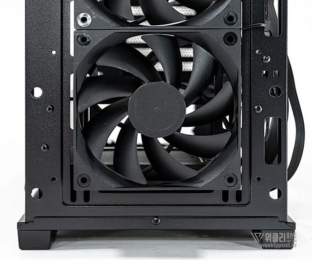 추가 장착이 가능한 쿨링팬 공간도 넉넉하다. 상단에는 120mm 팬 3개 또는 140mm 팬 2개, 하단에는 120mm 팬 2개, 측면에는 120mm 팬 2개를 추가할 수 있으며, 전면에 기본 팬을 제거하면 140mm 팬 2개를 장착할 수도 있다. 이를 통해 최대 11개의 쿨링팬을 구성할 수 있어 하이엔드 쿨링 시스템 구축도 가능하다.
