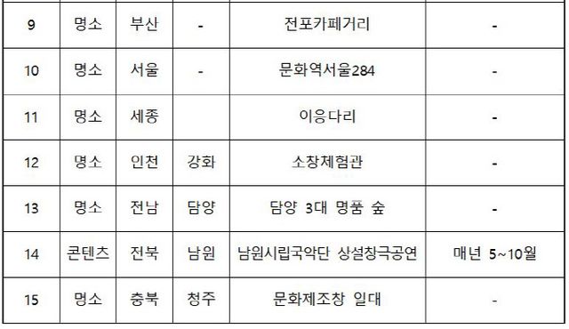 선정된 대상지는 △무릉별유천지 △서피비치 △춘천마임축제 △부천아트벙커비(B)39 △하회마을 △남도달밤야시장 △김광석다시그리기길 △테미오래 △전포카페거리 △문화역서울284 △이응다리 △소창체험관 △남원시립국악단 상설창극공연 △담양 3대 명품 숲 △문화제조창 일대 등 15곳이다.