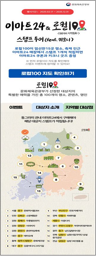 로컬100 스탬프 투어는 오는 12월 31일까지 연중 진행하며 누구나 이마트24 응용프로그램(앱)을 통해 참여 가능하다. ‘로컬100’ 중 행사 대상지로 선정된 명소와 축제 등 15곳의 인근 이마트24 점포에서 1000원 이상 결제 시 도장(스탬프)을 적립할 수 있다. 적립한 도장(스탬프) 수에 따라 ‘로컬100’ 홍보대사 키크니 작가가 직접 디자인한 로컬100 배지(3종)와 이마트24 할인권(5000원, 1만 원, 2만 원)을 상품으로 증정한다.