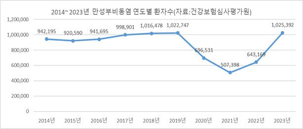 또 배미례 과장은 “성별 통계를 살펴보면 성인 남성보다 여성이 만성 부비동염으로 진료를 더 많이 보는 것으로 나타났다. 이는 해외 통계에서도 비슷하게 나타나고, 여성의 상대적으로 작은 코 및 부비동 구조, 여성의 면역 체계가 염증 반응을 더 쉽게 일으키는 특성, 그리고 여성 호르몬이 코 점막에 미치는 영향 등이 원인으로 생각된다. 또한 같은 만성 부비동염이라도 여성은 주관적 증상이 남성보다 더 심하게 느껴지는 경향이 있어 의료기관 방문이 더 많을 수 있다.”고 설명했다.