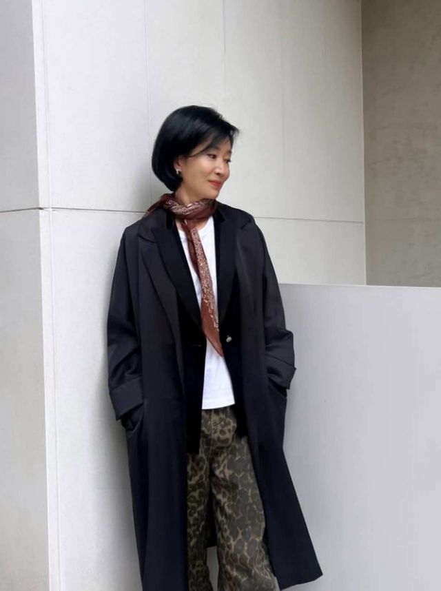 나영희는 와이드 핏 레오파드 팬츠에 얇은 블랙 아우터와 화이트 상의를 매치했다. 여기에 버건디 컬러의 스카프를 더해 우아하면서도 감각적인 스타일을 완성했다. 대담한 패턴이지만 톤 다운된 컬러와 베이직한 아이템을 적절히 조합해 과하지 않으면서도 트렌디한 분위기를 연출했다.