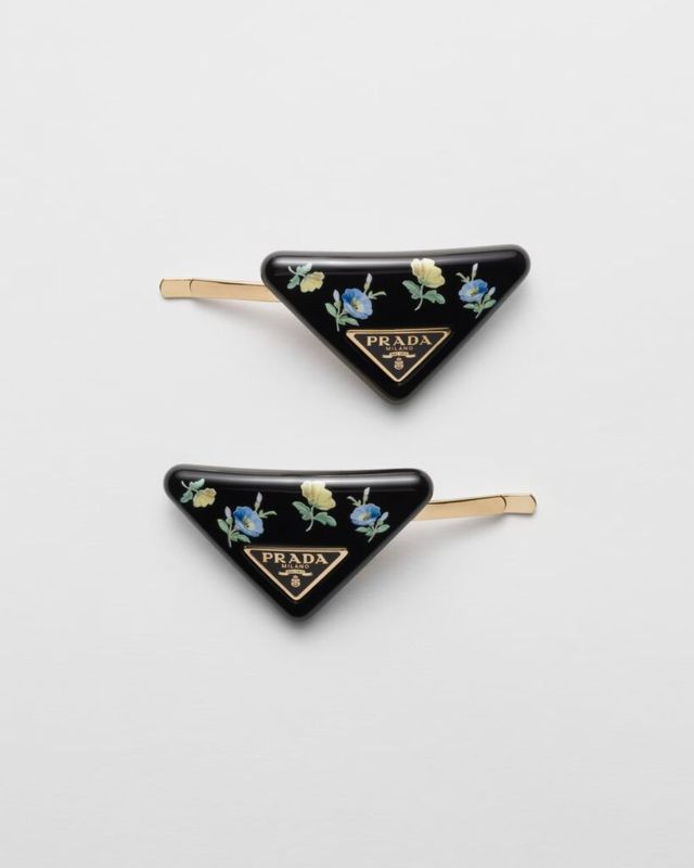 아이코닉한 기하학적 쉐입의 트라이앵글 로고가 특징인 프라다 플렉시글라스 및 메탈 헤어 바레트. 플로럴 디테일 장식이 더해져 봄과 어울리는 화사한 스타일을 완성해 줍니다.