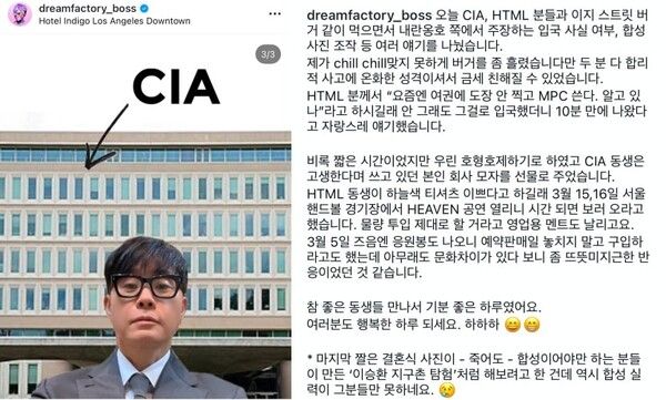 이승환은 18일 자신의 SNS에 글을 올리며 "CIA와 HTML 소속 분들과 함께 햄버거를 먹으며 내란옹호 쪽에서 주장하는 입국 사실 여부와 합성 사진 조작 등에 대해 이야기를 나눴다"고 전했다.