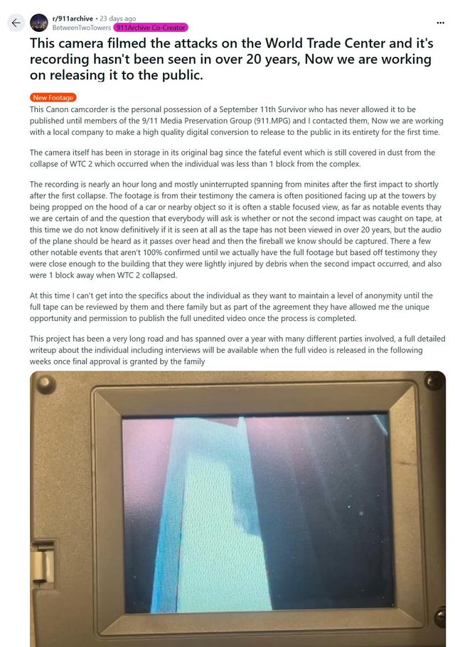 BetweenTwoTowers 라는 유저가 세계무역센터 바로 근처에서 (1 block away) 한 개인에 의해 촬영된 원본 테이프 뿐만 아니라 녹화한 캐논 캠코더 자체를 넘겨받았다는 소식을 알린다.