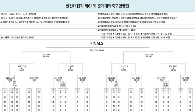 오는 21일 광주대와 칼빈대, 명지대와 세경대, 상지대와 대구대, 김해대와 연세대가 대회 20강전을 펼친다. 여기서 승리해야 16강에 진출할 수 있다.
