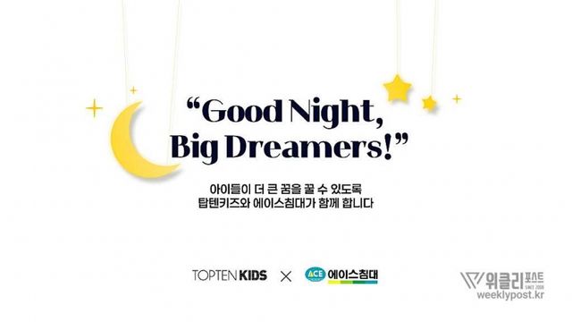 탑텐키즈가 에이스침대와 함께 아이들의 올바른 수면 습관 형성을 위한 Good Night, Big Dreamers 캠페인을 전개한다. 이번 협업은 편안한 잠자리가 아이들의 성장과 상상력 발달에 중요한 요소라는 점에 공감하며, 최적의 수면 환경을 조성하는 데 도움을 주고자 기획됐다.