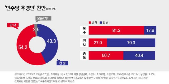 정파별로는 민주당(반대 17.6% vs 찬성 78.5%)과 국민의힘(94.3% vs 5.1%) 지지층 사이에 찬반 여론이 극명한 차이를 보이며 당파적 배열이 또렷했다.