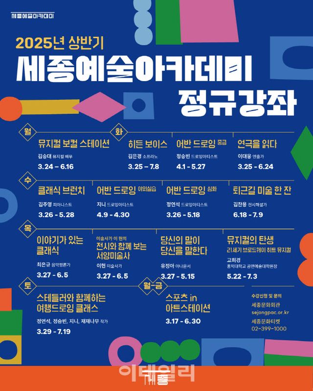 세종예술아카데미 수강 신청은 세종문화회관 홈페이지 및 콜센터를 통해 할 수 있다. 3월 14일까지 신청한 수강생에게는 20% 조기 신청 할인을 제공한다. 다양한 강의를 듣고 싶은 시민들을 위해 ‘스테들러와 함께하는 여행드로잉 클래스’를 제외한 전 과정을 약 48% 할인된 가격에 수강할 수 있는 올패스 패키지도 준비했다.