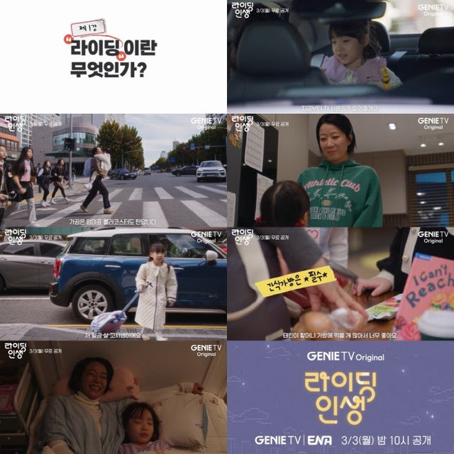 오는 3월 3일 첫 공개되는 지니 TV 오리지널 드라마 ‘라이딩 인생’(연출 김철규/극본 성윤아 조원동/기획 KT스튜디오지니/제작 베티앤크리에이터스)은 딸의 ‘7세 고시’를 앞둔 열혈 워킹맘 정은이 엄마 지아에게 학원 라이딩을 맡기며 벌어지는 3대 모녀의 ‘애’태우는 대치동 라이프를 그린 드라마다.