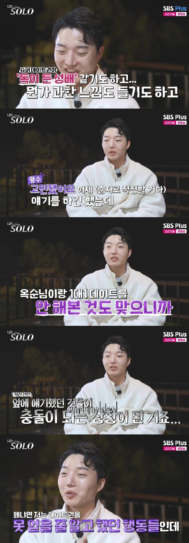 인터뷰에서 그는 "독이 든 성배 같기도 하고. 과한 느낌도 들기도 한다. 고민됐다. 어제 (순자로 직진할 거다) 얘기를 하긴 했는데 옥순님이랑 1대1 데이트를 안 해본 것도 맞으니까"라고 직진 선언이 충돌되는 상황에 난감을 표했다.