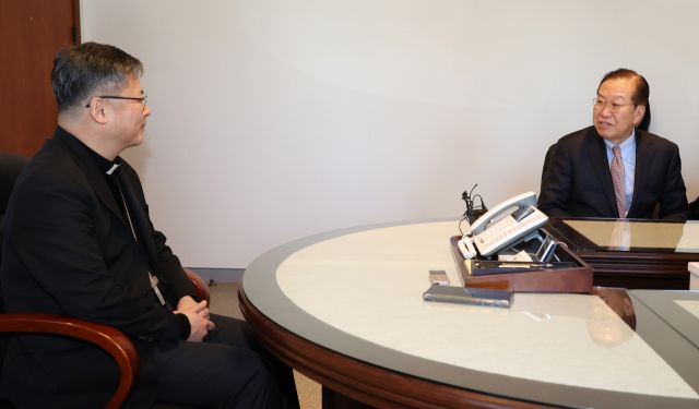 권 비대위원장은 19일 오후 3시께 서울 중구 천주교 서울대교구청을 찾아 정 대주교를 예방했다. 이 자리에서 정 대주교는 권 위원장에게 "우리 정치가 양극단으로 가고 있어서 그 어느 때보다 국민들이 우려하고 불안해하고 있다"며 "우리 정치 지도자들께서 국민을 보듬어주는 그런 화합의 정치를 신경써 주시면 좋겠다"고 제안했다.
