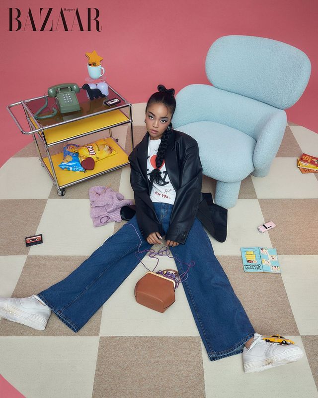 레더 재킷, ‘러브 뉴욕’ 티셔츠, 데님 팬츠, ‘다이스’ 싱글 귀고리, ‘바이 나우 코치 소호’ 스니커즈, 곳곳에 자리한 카세트테이프·핑크 택시·옐로 택시 모티프 슈 참, 사이드 테이블에 놓인 별·공룡·하트 모양 지갑, 톱 핸들 프레임 백은 모두 Coach.