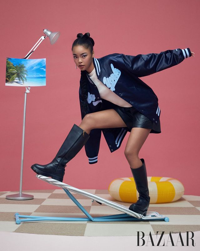 ‘런웨이 뉴욕’ 재킷, 로고 엠브로이더리 톱, 레더 쇼츠, ‘본’ 싱글 귀고리, ‘줄리엣’ 레더 부츠는 모두 Coach.