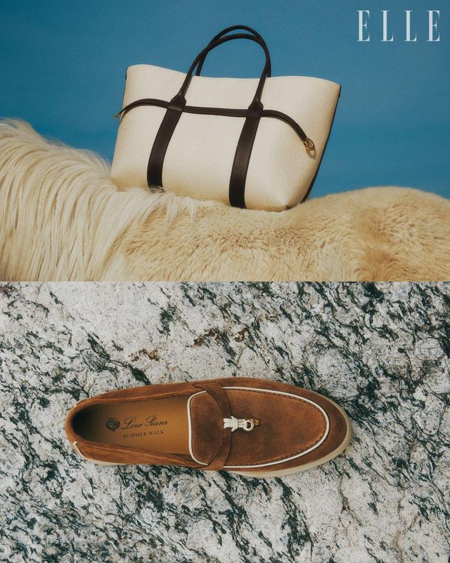 (아래) 브라운 컬러 아이콘 화이트 솔 서머 참스 워크 로퍼는 Loro Piana.