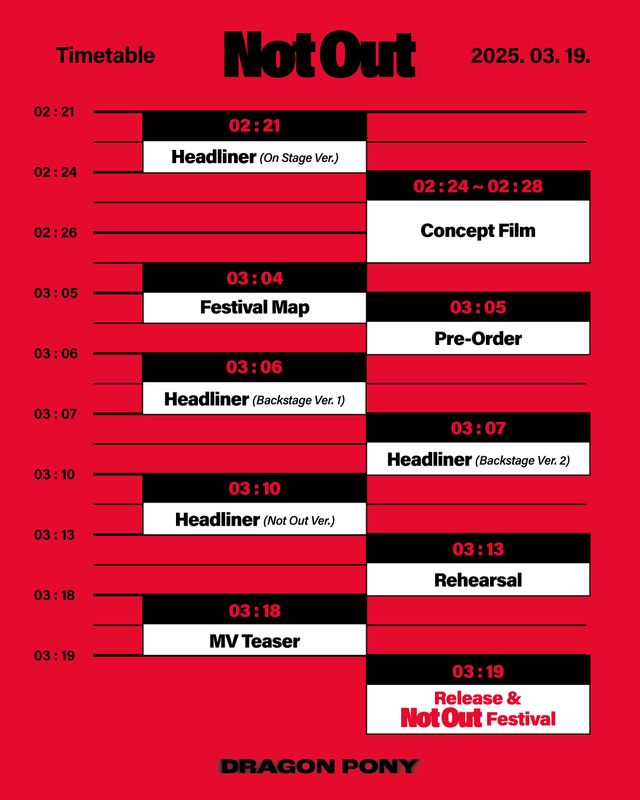 소속사 안테나는 지난 20일 공식 SNS를 통해 드래곤포니의 두 번째 EP '낫 아웃(Not Out)' 타임테이블을 공개하고 오는 3월 19일 컴백 소식을 알렸다.