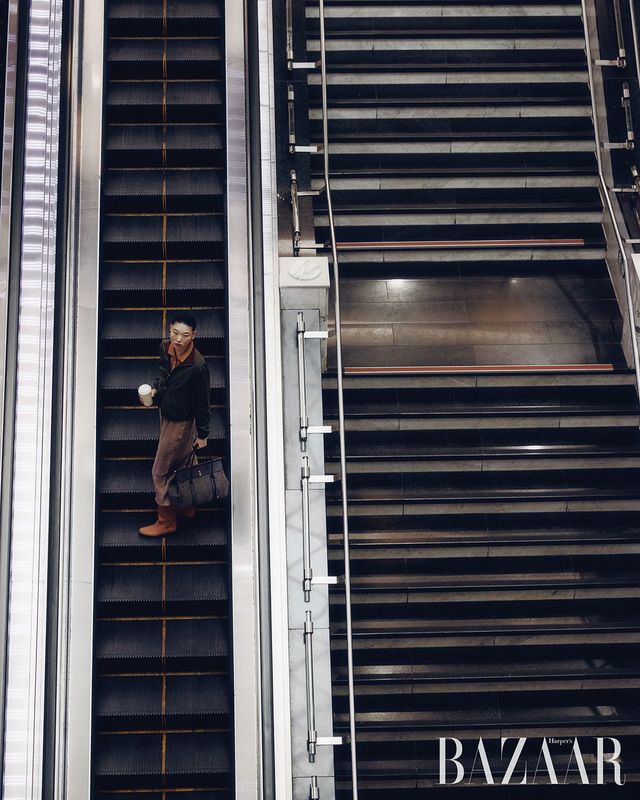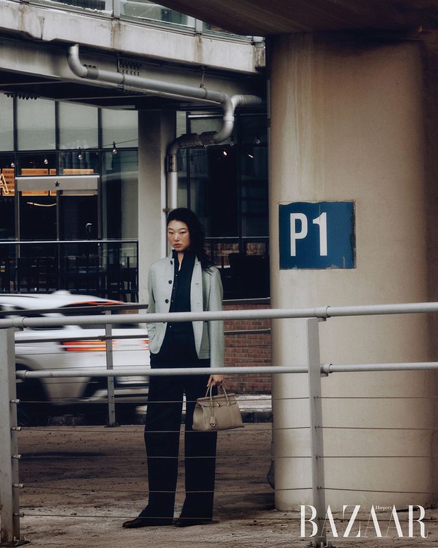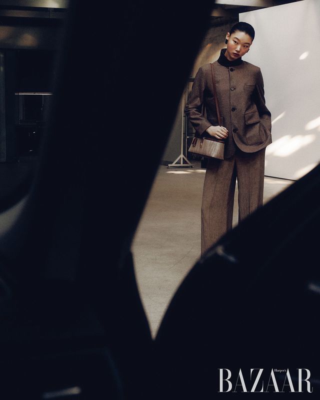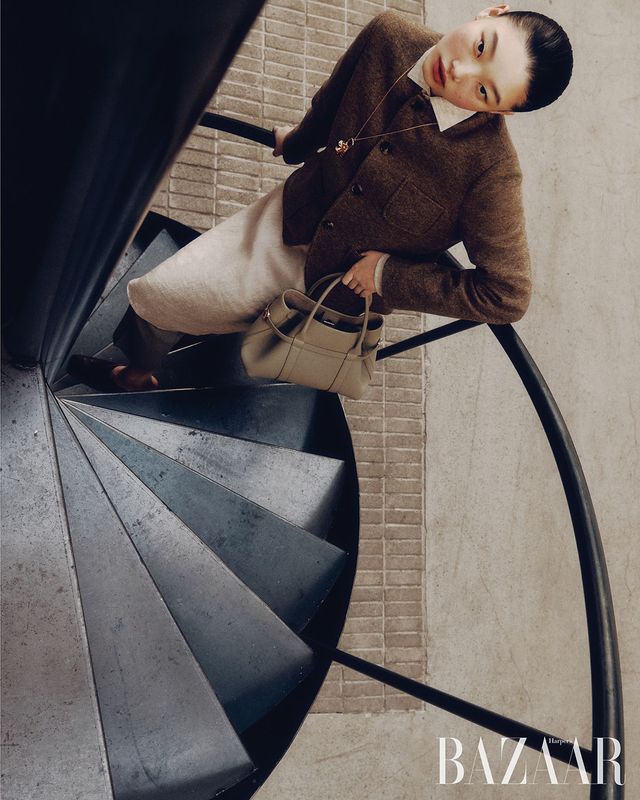 ‘아이콘 스파냐’ 미니 재킷, 베스트, 팬츠, ‘룸 L25’ 백, ‘아이콘 세르지오’ 로퍼는 모두 Loro Piana.