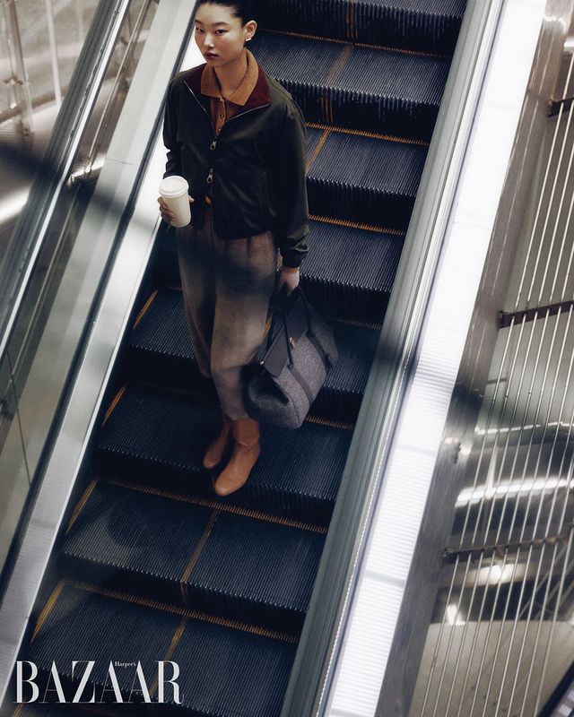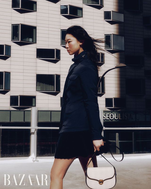 ‘아이콘 트래블러 윈드메이트Ⓡ’ 재킷, 스커트, ‘기에라’ 스몰 백은 모두 Loro Piana.