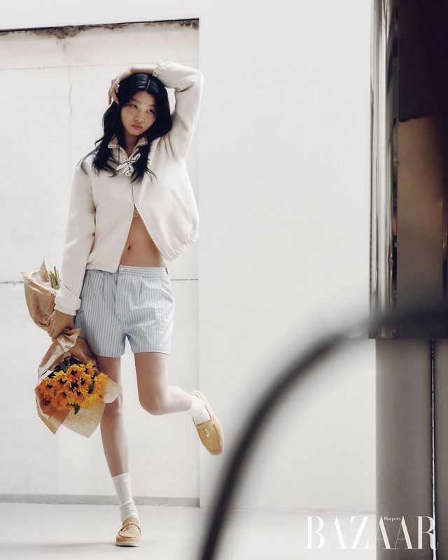 ‘아이콘 로드스터’ 미니 재킷, 실크 소재의 버뮤다 쇼츠, 귀고리, ‘룸 L25’ 백은 모두 Loro Piana.