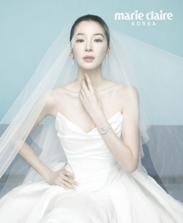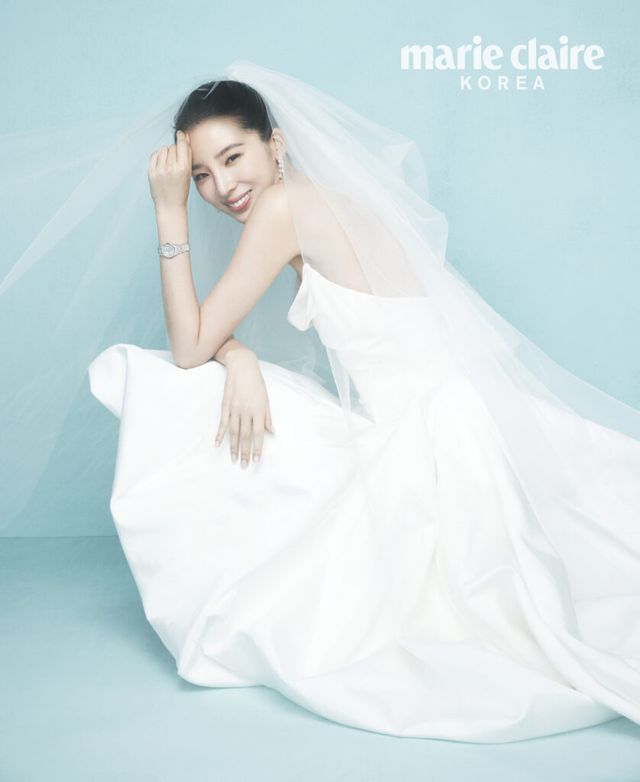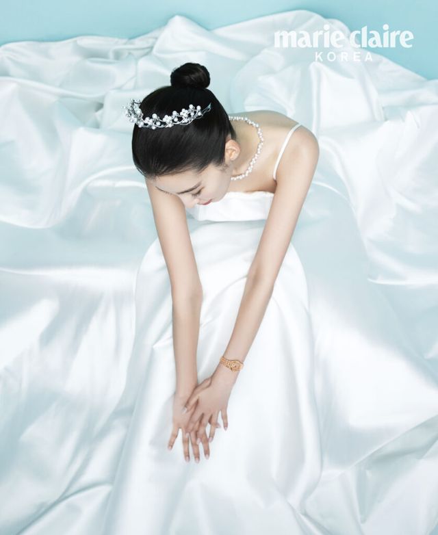 다이아몬드 가루를 흩뿌린 듯 잔잔하게 반짝이는 18K 화이트 골드 소재의 로열 오크 미니 프로스티드 골드 쿼츠 워치 23mm 5천만원대 Audemars Piguet, 튜브톱 드레스 Vivienne Westwood by SOYOO BRIDAL, 다이아몬드 이어링 Graff, 웨딩 베일 Rosetteblanc.