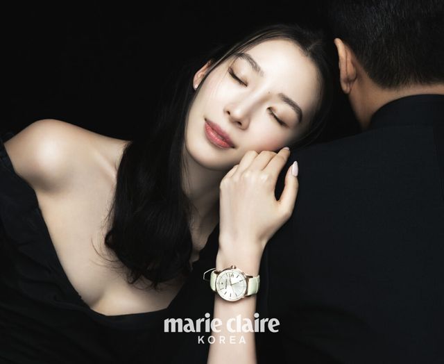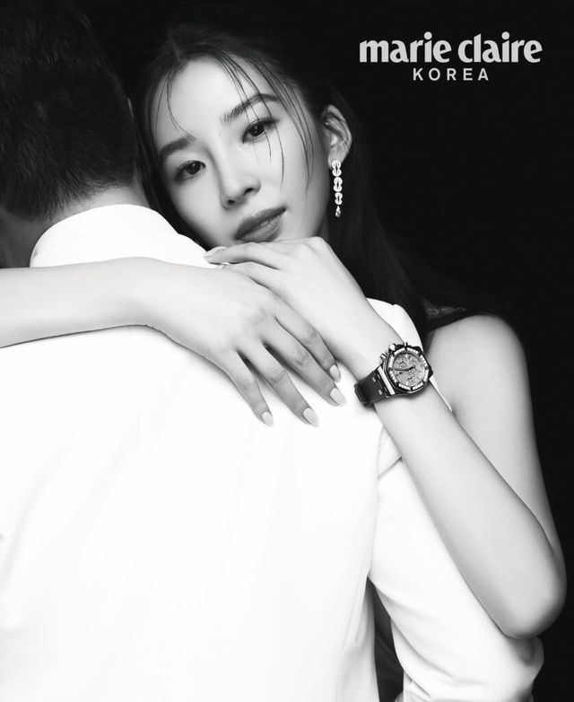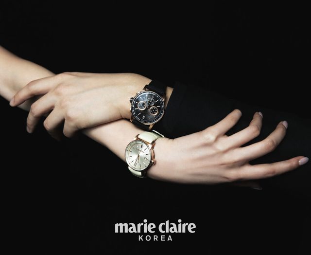 IRENE 18K 핑크 골드 케이스와 아이보리 앨리게이터 가죽 스트랩의 조합이 매력적인 코드 11.59 바이 오데마 피게 셀프와인딩 워치 38mm 4천만원대 Audemars Piguet, 오프숄더 드레스 Vivienne Westwood by SOYOO BRIDAL, 이어링 Messika.