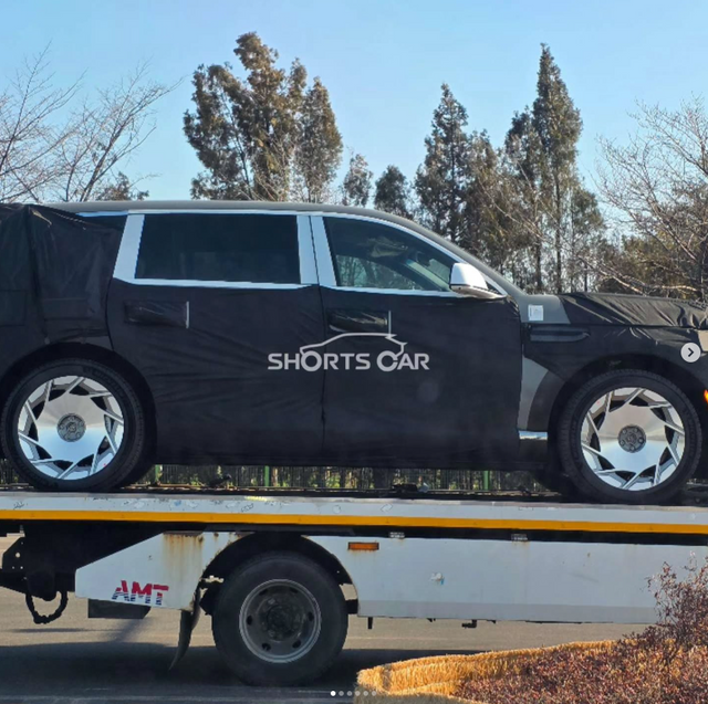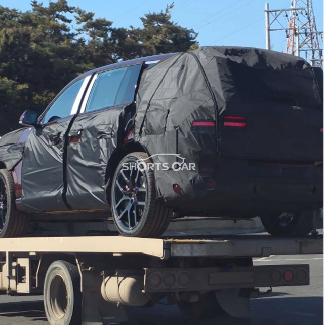 이번에 포착된 GV90 LWB 모델은 견인차에 실려 있는 모습이다. 눈에 확 띄는 부분은 B필러가 없는 코치 도어라서 지지대 역할을 하는 2열 유리창 뒤쪽 필러(C필러 부분)가 상당히 두꺼운 것을 확인할 수 있다.
