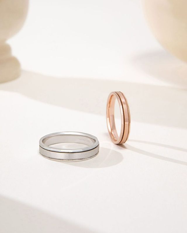 이름부터 로맨틱한 마리벨 컬렉션. 결혼을 의미하는 불어 ‘Mariage’와 아름다움을 뜻하는 ‘Belle’의 조합처럼, 가장 소중한 순간을 위해 탄생한 커플링입니다. 플랫한 무광 밴드에 밀그레인 라인과 섬세한 컷팅 디테일이 더해져 우아하면서도 입체적인 분위기를 자아내죠. 남성용은 화이트 골드, 여성용은 로즈 골드로 구성되어 둘이 함께 착용했을 때 더욱 조화로운 무드를 연출할 수 있어요.