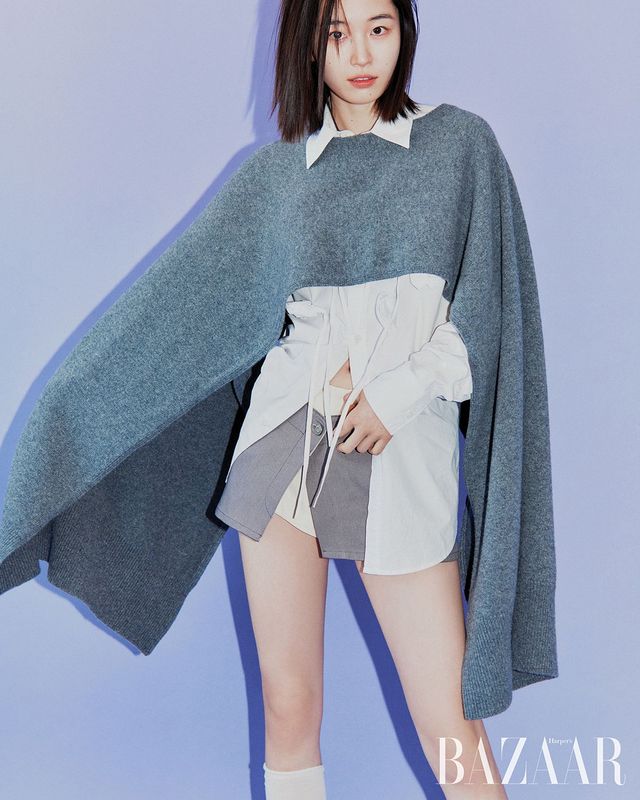 케이프 톱은 Leha. 코르사주 장식 셔츠는 Bmuet(te). 스커트, 이너 브리프는 Open YY. 양말은 스타일리스트 소장품.