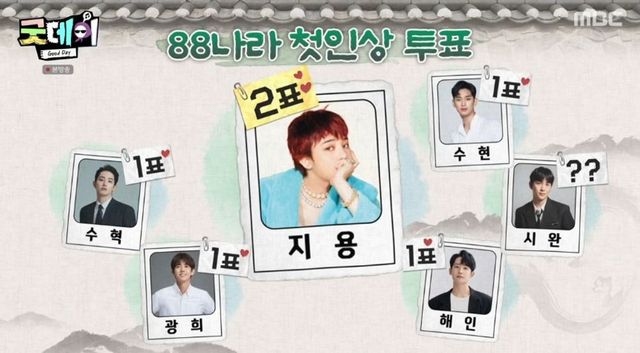 이날 ‘88나라’ 첫인상 투표가 꾸며진 가운데 지드래곤은 황광희와 정해인의 선택을 받으며 최다득표자로 등극했다. 이 밖에도 김수현, 이수혁, 황광희, 정해인이 1표씩을 획득한데 반해 임시완은 0표로 예상 밖의 굴욕을 당했다.