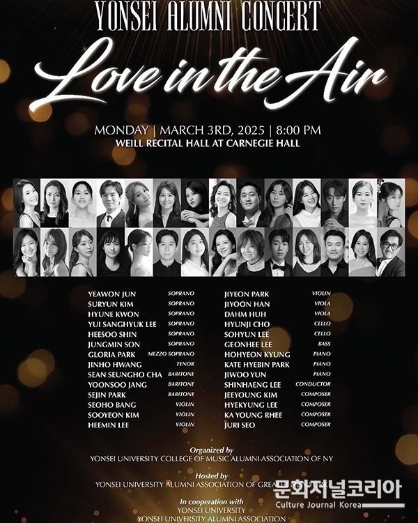 연세대학교 동문회 뉴욕지구가 주최, 연세대학교 음악대학 뉴욕동문회가 주관하는 이번 음악회는 이날 오후 8시 카네기홀 와일홀에서 ‘Love in the Air’라는 주제로 28명의 연세대 출신 음악인들이 한자리에 모여 다채로운 공연을 펼쳐지는 무대이다.