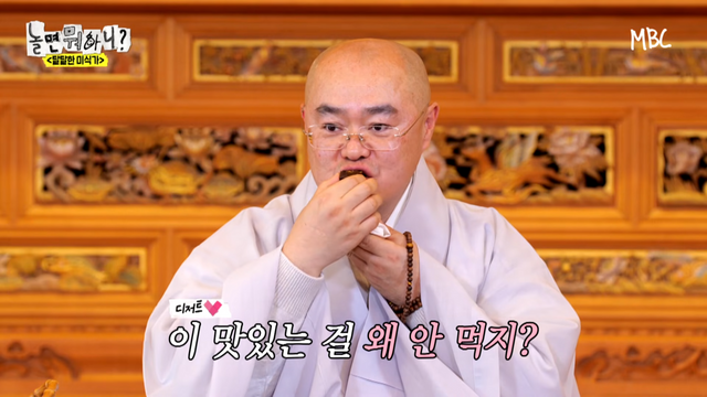 마지막 코스는 식당이 아니라 엉뚱하게도 사찰이었습니다. 동대문구 회기동에 위치한 연화사였는데요. 연화사 주지를 맡고 있는 묘장 스님이 멤버들을 반겼죠. 디저트에 지친 이들은 푸릇한 산채비빔밥을 기대했지만 스님이 내어오신 건 작설차와 두바이 초콜릿이었습니다. 속세 가득한 뜬금없는 음식에 멤버들은 리액션이 고장 나버렸죠. 스님은 “방문객들이 부처님, 스님에게 공양 올릴 때 본인들이 제일 좋아하는 걸 올리기 때문에 최신 유행하는 디저트나 과자들이 많이 올라온다”라고 설명하며 오히려 “먹기 전에 사진들은 안 찍어요?”라고 물어 웃음을 자아냈죠. 결국 세끼를 전부 디저트로 배를 채운 하하는 국밥을 외치며 절규했습니다. 주우재는 회심의 미소를 지었고요.