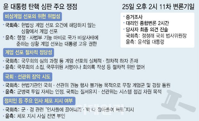 헌재는 11차 기일에서 증거조사 후 청구인 측인 국회와 피청구인 측인 윤 대통령 대리인단에 2시간씩 최종 의견을 밝힐 시간을 부여할 예정이다. 이후 소추위원 정청래 국회 법제사법위원장과 피청구인 윤 대통령이 각각 최종 의견을 진술하면 변론이 마무리된다. 이후 재판관들은 의견을 나누는 평의를 거쳐 최종 선고 기일을 지정할 것으로 예상된다. 선고 결과는 재판관 평의에서 표결 절차(평결)를 거쳐 최종 결정된다.