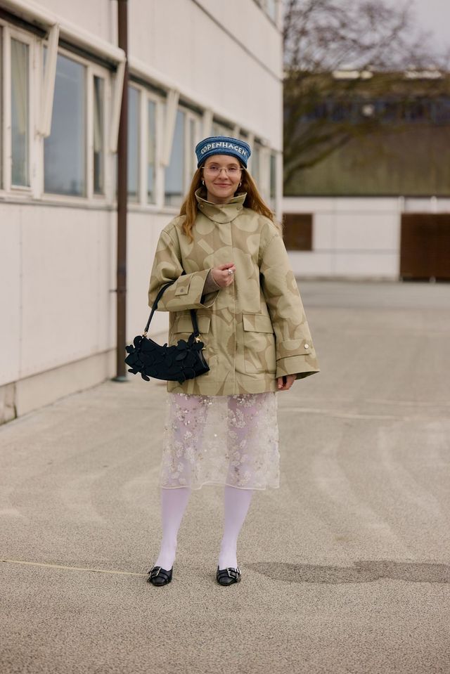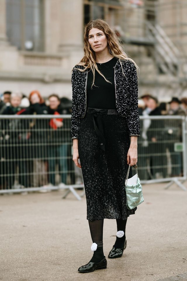 기본 중의 기본, 블랙 스타킹도 빼놓을 수 없겠죠? 베로니카 헤일부르너는 하늘거리는 샤넬의 블랙 시스루 미디 스커트에 블랙 스타킹을 신고, 화이트 카멜리아 장식 양말을 레이어링했습니다. 스키아파렐리의 화려한 골드 앤 블랙 룩을 보다 드라마틱하게 완성해 주는 키 아이템도 바로 블랙 스타킹이죠.