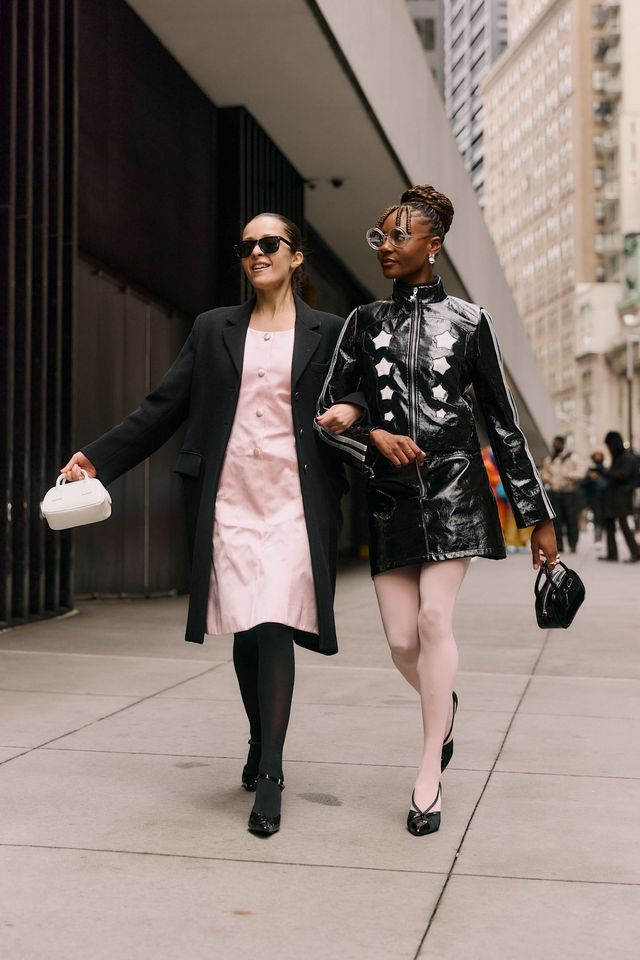 블랙 앤 화이트 스타킹을 사이좋게 나눠 신고 패션위크 나들이에 나선 1960년대 빈티지 무드의 베스트 프렌드 룩을 보니, 패션에 나이는 없다는 말이 절로 떠오르는군요.
