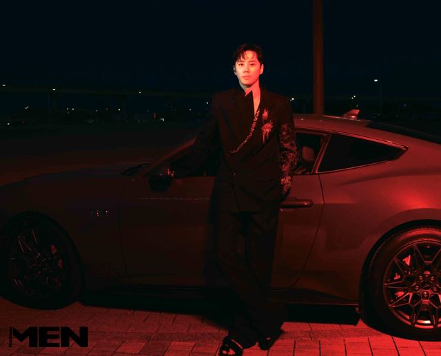 골드 엠브로이더리 디테일 재킷과 와이드 핏 팬츠, 모피 샌들 모두 Dries Van Noten,머스탱 GT 차량 Ford.