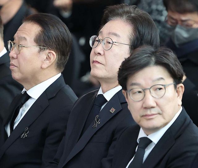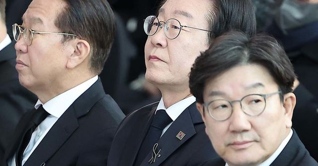 권영세 국민의힘 비상대책위원장(왼쪽부터), 이재명 더불어민주당 대표, 권성동 국민의힘 원내대표가 1월 18일 오전 전남 무안국제공항에서 열린 12·29 무안국제공항 제주항공 여객기 참사 희생자 합동 추모식에 참석하고 있다. / 뉴스1