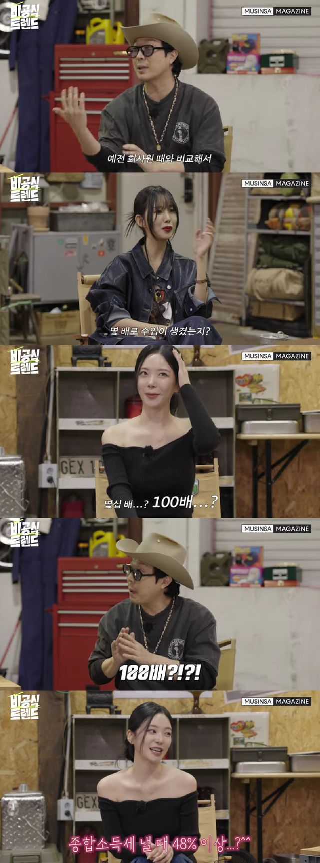 하하는 "예전 회사원 다닐 때와 비교해서 몇 배로 수입이 생겼냐"고 물었고, 윤하정은 "100배"라며 "종합소득세 낼 때 48%이상 낸다"고 솔직하게 수입을 공개했다.