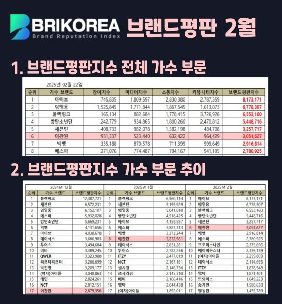 최근 한국기업평판연구소는 가수 브랜드 빅데이터를 분석( 2025년 1월 22일부터 2025년 2월 22일) 한 결과, 이찬원이 2월 브랜드평판지수 3,051,627을 기록했다고 밝혔다. 이는 전체 6위에 해당한다.