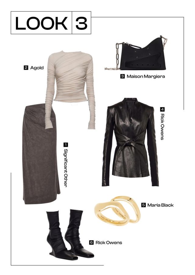 레더 소재 특유의 시크한 무드를 강조하고 싶다면 슬림한 핏의 레더 재킷이 제격입니다. 여기에 맥시 스커트와 레더 앵클 부츠까지 더하면 여성스러운 분위기가 배가되는 것은 물론, 전체적인 비율까지 길어 보이는 효과를 낼 수 있어요. 시크한 무드를 배가시키기 위해 액세서리와 가방은 미니멀한 디자인으로 선택하는 걸 추천할게요. 특히, 심플한 골드 링을 더하면 과하지 않으면서도 세련된 분위기를 연출할 수 있을 거예요.