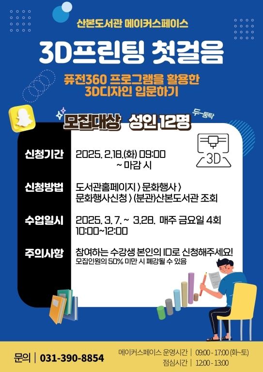 메이커스페이스 교육 프로그램 신청은 군포시 도서관 홈페이지(문화행사 신청)에서 가능하며, 자세한 사항은 산본도서관 메이커스페이스(031-390-8854)로 문의하면 된다.