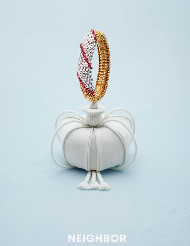 Van Cleef&Arpels 촘촘하게 직조한 듯한 유니크한 디자인의 타피세리(Tapisserie) 브레이슬릿. 플래티넘과 옐로·로즈 골드 보디 위 다이아몬드, 루비를 선형적 형태로 세팅했다(1962).