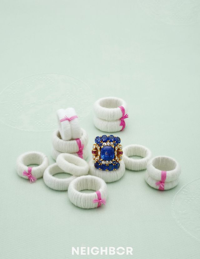 Van Cleef&Arpels 7.10캐럿에 달하는 오벌 컷 사파이어 센터 스톤을 중심으로 다양한 크기의 다이아몬드, 루비, 사파이어를 세팅해 신비로운 빛을 발산하는 옐로 골드 링(1940).