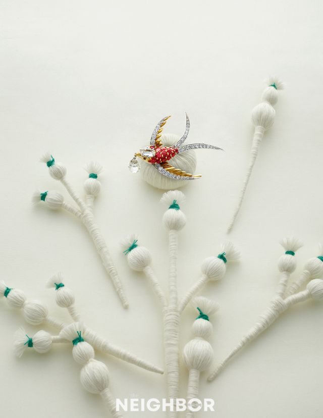 Van Cleef&Arpels 다이아몬드 드롭을 입에 물고 날갯짓을 하는 새의 모습을 형상화한 플래티넘&옐로 골드 소재 클립. 날렵한 곡선형 보디 위로 다이아몬드와 루비를 빼곡하게 장식했다(1960).